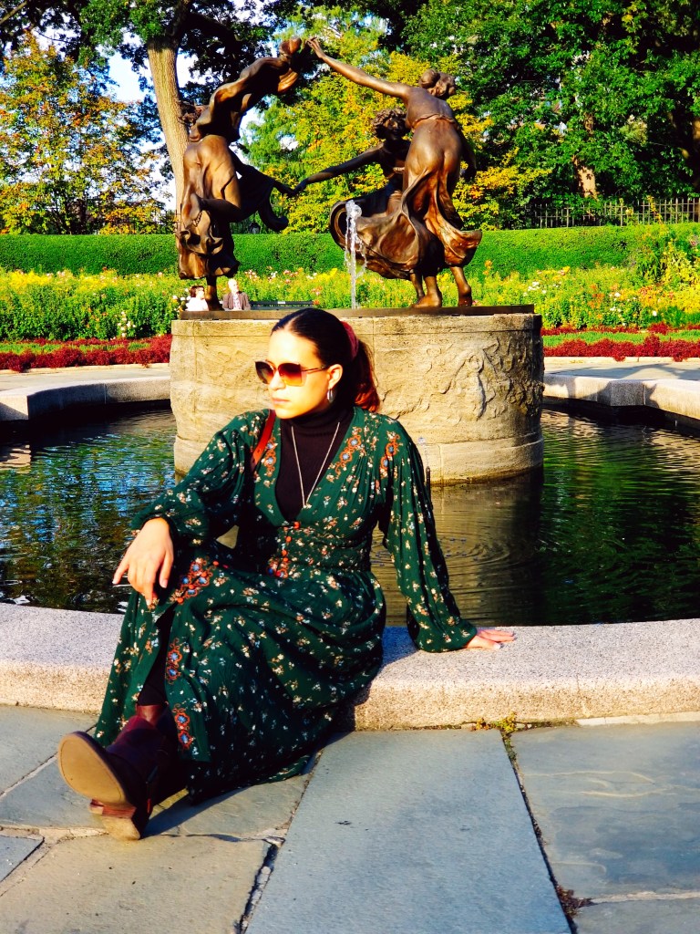 Given my entomophobia, Fall is the safest time for me to visit gardens. Especially in the earlier months, a lot of the flowers are still alive and most of the creepy crawlies have cleared out. So, with a little flutter in my heart, I made my way to the Conservatory Garden. Three things happened consecutively from the moment hubby and I set foot on the florid grounds. A bee flew past my booted feet, hubby muttered a long-suffering “uh-oh”, and I reassured him through gritted teeth that if he remained calm then I would try my best to do the same. But we faced no incident after that tiny hitch, and the garden rewarded my tenacity with plenty of gorgeous flowers in a (mostly) insect-free environment. The blooms and the shrubs, still untouched by the ravages of Fall, mirrored the floral embroidery on my emerald dress.