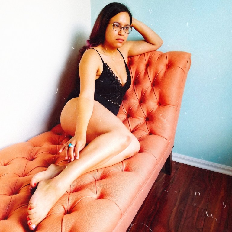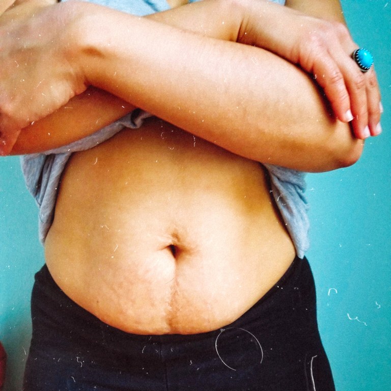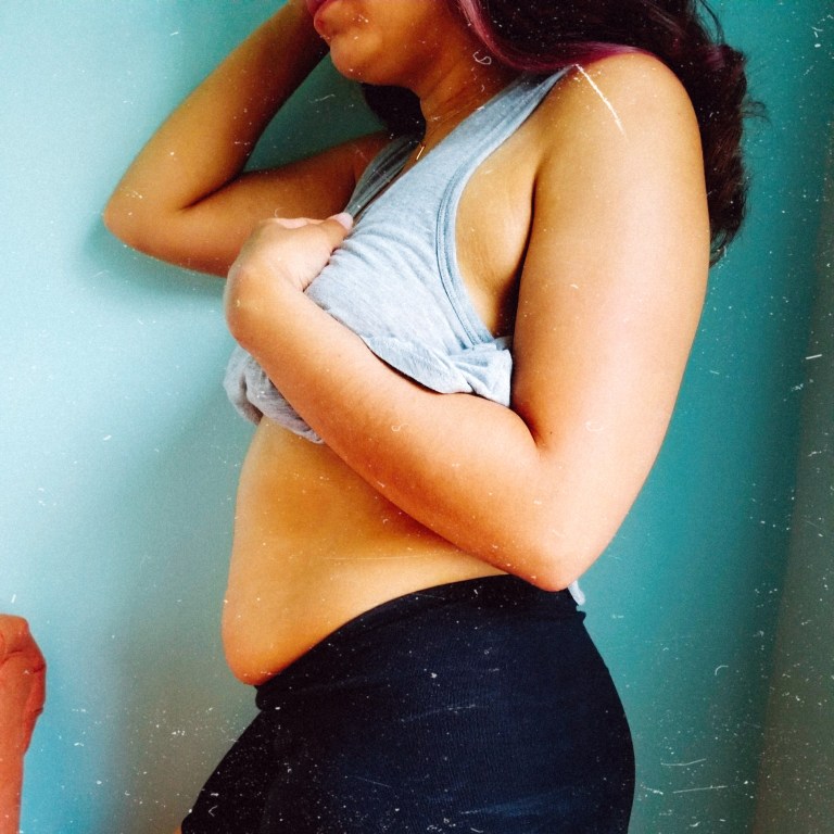 - And yes, my stomach puffs out, soft and stretch-marked from growing another human in my body.